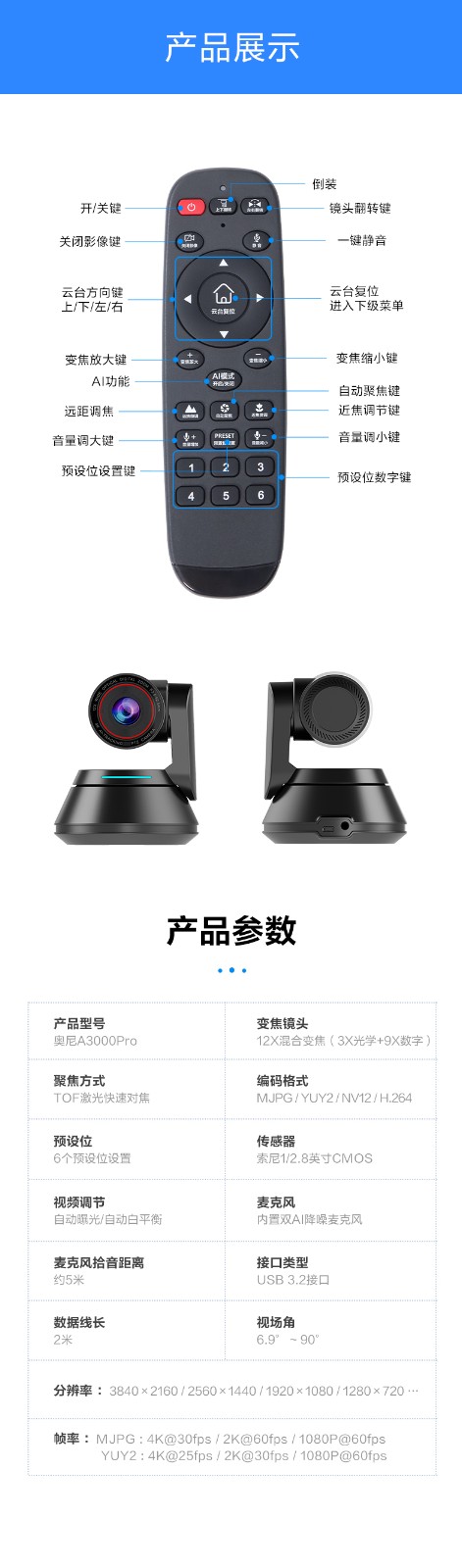 • 支持2.4G无线遥控控制/多预置位设置;